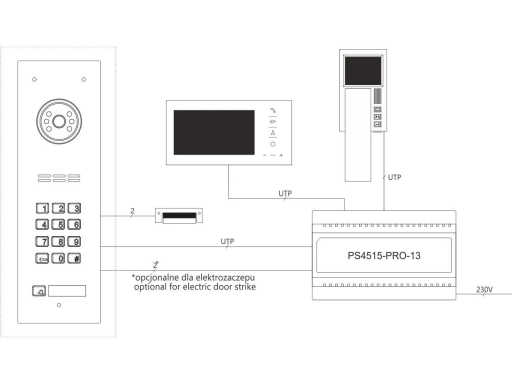 | – opcja zabezpieczonego sterowania otwieraniem drzwi: elektrozaczep podłączamy do opcjonalnego modułu PRO-I/O (styki przekaźnika), a panel załącza otwieranie poprzez magistralę systemu | |