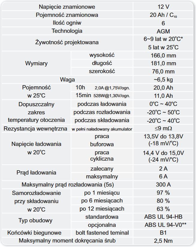 Akumulator AGM EUROPOWER serii EV 12V 20Ah/C10 - DANE TECHNICZNE: