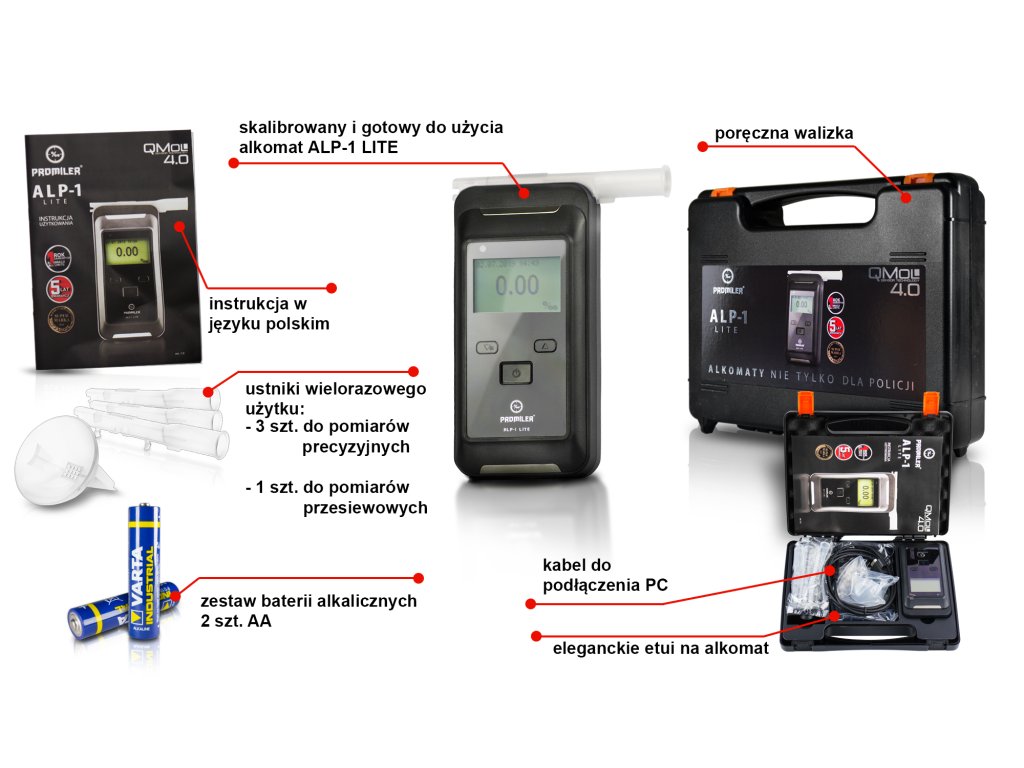 - Skalibrowany i gotowy do użycia alkomat ALP-1 Lite
