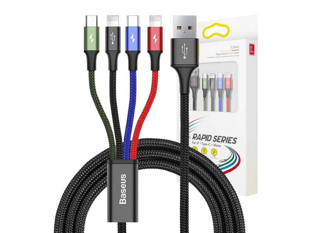 Vysokokvalitný kábel umožňuje rýchlo a bezproblémovo nabíjať štyri zariadenia súčasne - dve s konektormi Lightning a po jednom s konektormi USB-C a Micro USB. Jeden kábel Lightning navyše podporuje prenos dát. Každý kábel má inú farbu, vďaka čomu ich možno ľahko rozlíšiť. Kábel podporuje nabíjanie prúdom až 3,5 A (max. 2 A na kábel) a vďaka širokej kompatibilite je univerzálny. Hliníkové koncovky sa vyznačujú vysokou odolnosťou, zatiaľ čo nylonový oplet je odolný voči poškodeniu a oderu a zabraňuje zamotaniu kábla. Priložená viazacia páska na kábel uľahčuje skladovanie a organizáciu kábla.