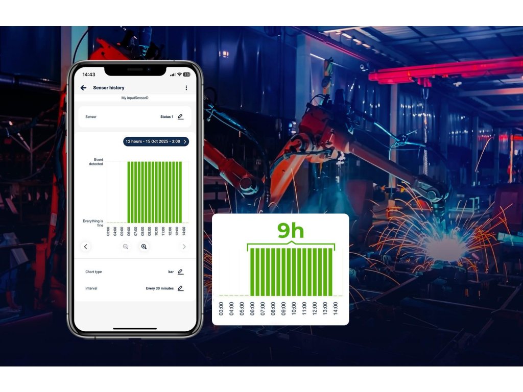 Interaktywne wykresy z danymi historycznymi pozwalają szybko sprawdzić czas pracy urządzenia w ciągu dnia, tygodnia lub miesiąca, co ułatwia analizę i planowanie przeglądów okresowych.