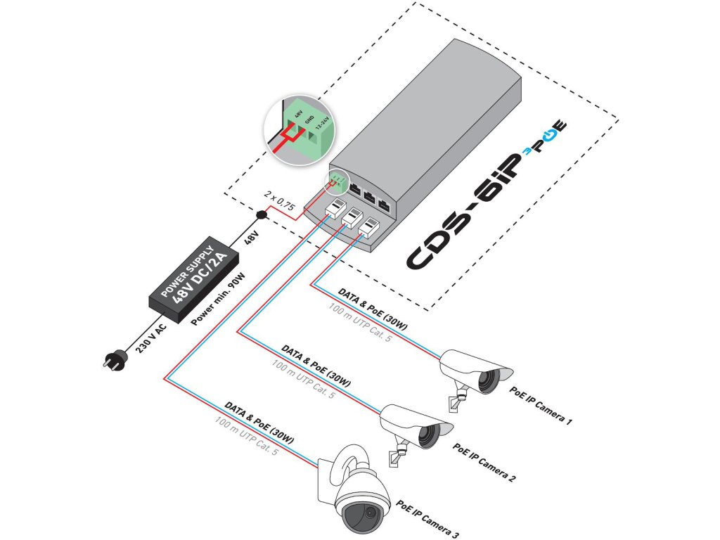 3x PoE+ to oszczędność i szybsza instalacja. W każdym zestawie znajdziemy zasilacz o wydajności 24W który zapewni prąd dla kamer IP o łącznej mocy 15W. W przypadku większych kamer wystarczy podłączyć zasilacz 48V DC o odpowiedniej wydajności prądowej np. ZS-48V/2A. System bezprzewodowy CDS-6IP 3PoE posiada porty PoE w standardzie PoE 802.3at/af o mocy 30W/port co daje aż 90W wydajności prądowej i umożliwia podłączenie nawet bardzo dużych kamer IP PTZ.