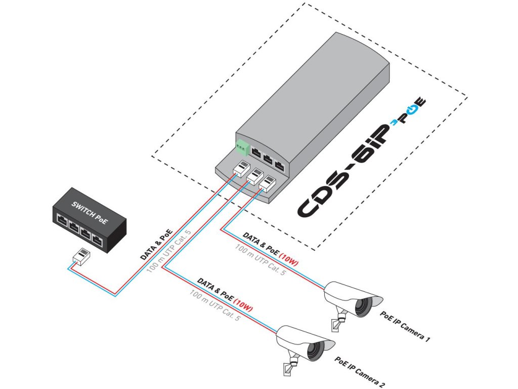 CDS-6IP 3PoE to jednostka dwukierunkowa która transparentnie przesyła wszystkie dane pomiędzy sieciami. Nie ma konieczności nadawania tej samej rodziny adresów IP co w kamerze. Tą samą rodzinę adresacji muszą posiadać przede wszystkim urządzenia radiowe, które się komunikują bezprzewodowo.