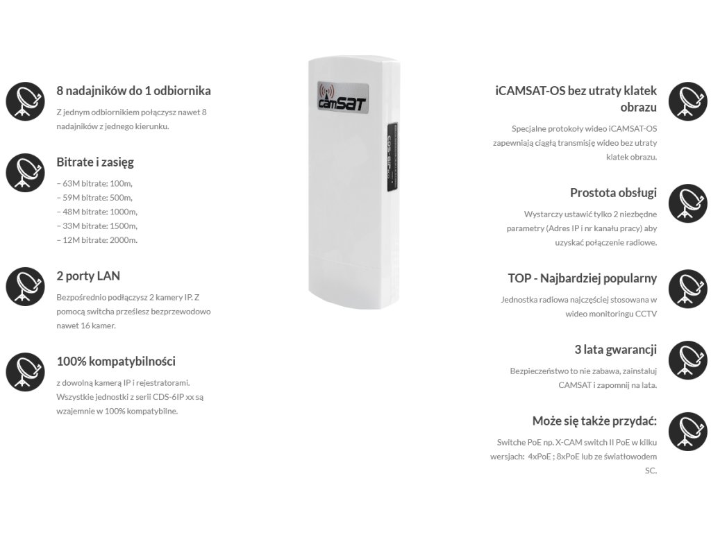 CDS-6IPeco to bardzo łatwy w konfigurowaniu bezprzewodowy system transmisji przeznaczony do przesyłu sygnału audio/wideo w paśmie częstotliwości 5 GHz. System jest przeznaczony do bezprzewodowego połączenia kamer IP z rejestratorem na odległość do 2km (opcja: do 5km). Dwu kierunkowa transmisja zapewnia przesłanie wszystkich danych w obu kierunkach. Najnowsze wersje współpracują z kamerami IP o bardzo wysokiej rozdzielczości do 16 Mpix – UHD, 4K, HD.