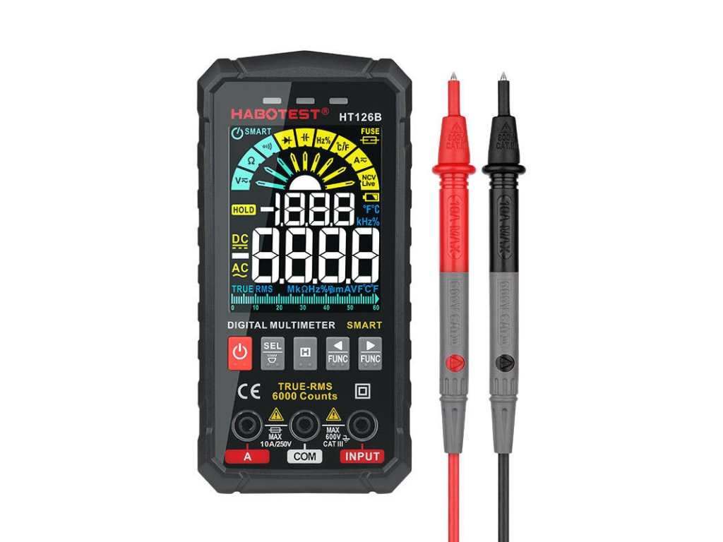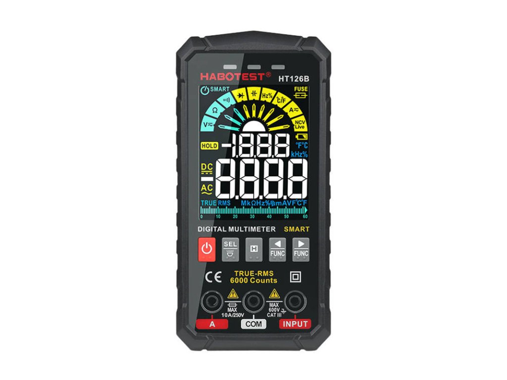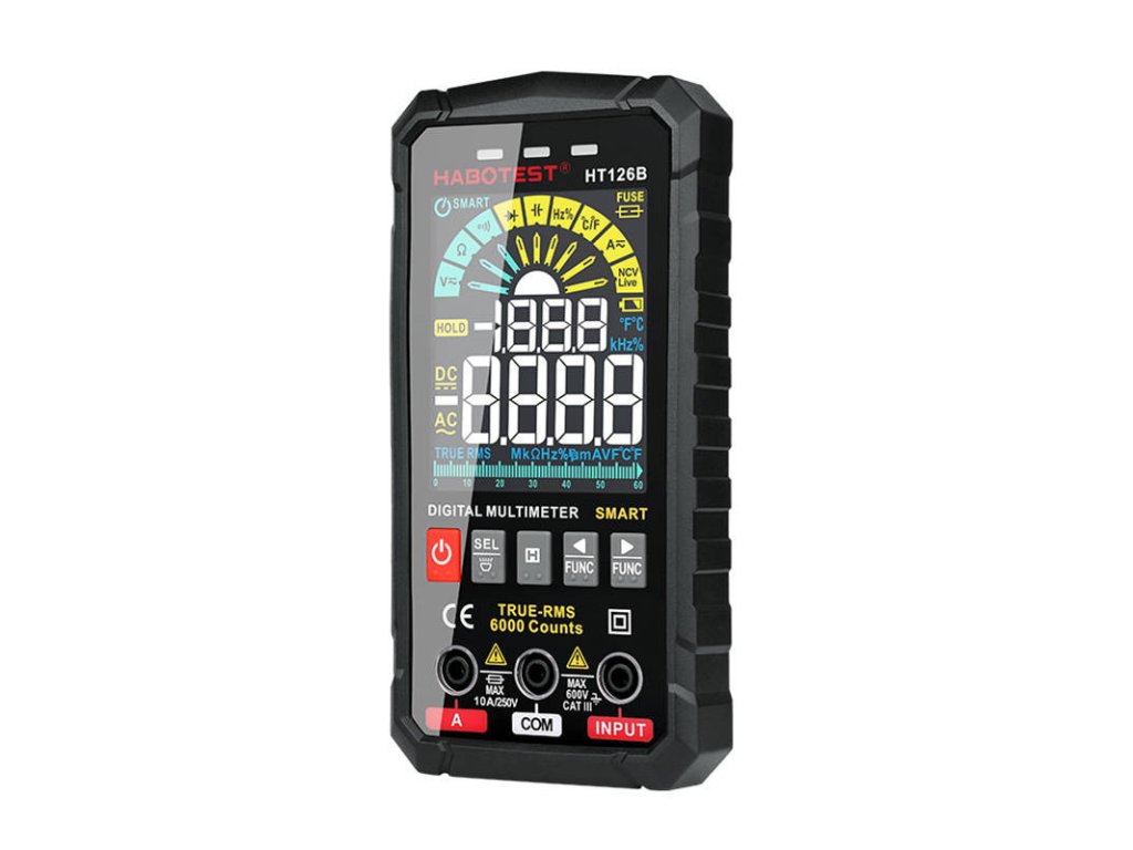 HT126B je inteligentný a robustný multimeter od spoločnosti Habotest. Vyznačuje sa presnými meraniami a môžete ho používať aj vo vonkajšom prostredí. Je vybavený veľkým farebným displejom a silikónovými tlačidlami - jeho používanie je jednoduché a pohodlné. Je kompaktný a ľahký - má aj LED svietidlo, takže môžete pracovať aj na tmavých miestach. Vyžaduje 4 batérie AAA 1,5 V (nie sú súčasťou dodávky). Môžete ho použiť na meranie napätia, odporu, kapacity atď.