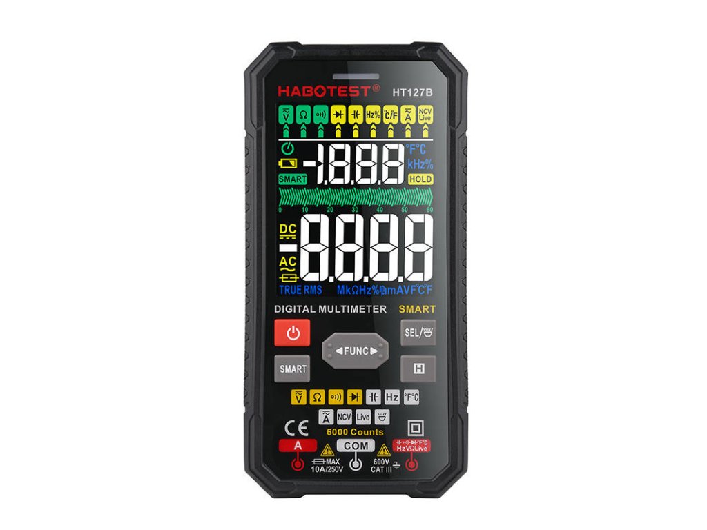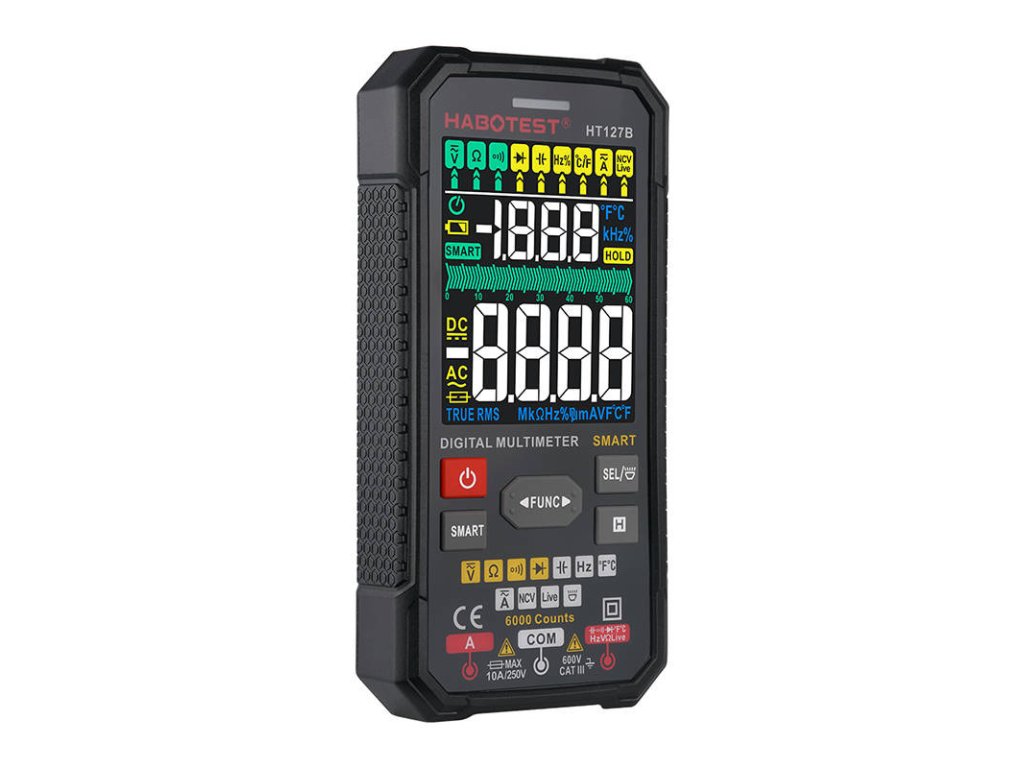 Digitálny univerzálny multimeter Habotest HT127B je praktické zariadenie, ktoré prekvapí mnohými možnosťami. Umožňuje okrem iného vysoko presné meranie striedavého a jednosmerného napätia a prúdu, odporu, teploty alebo kapacity. Okrem toho ponúka funkciu Live Test, umožňuje testovanie diód, bezkontaktnú detekciu napätia (NCV) a mnoho ďalšieho. Dôležité je, že multimeter má praktické tlačidlá, pomocou ktorých môžete efektívne vyberať funkcie.