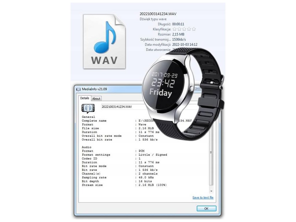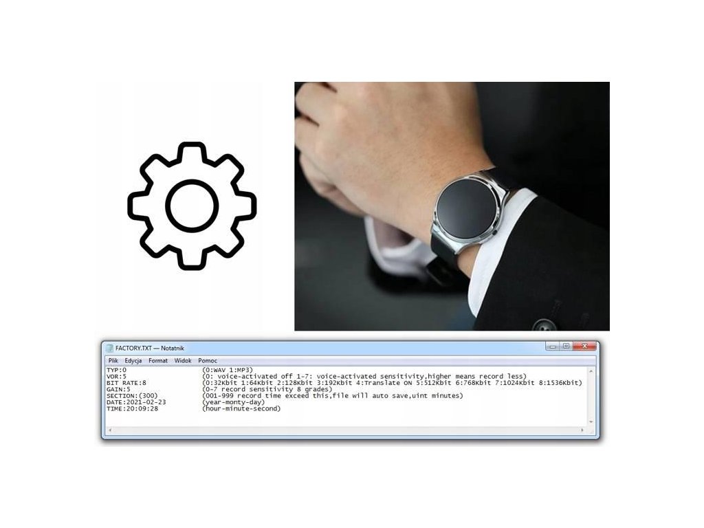 - Miniaturowy dyktafon ukryty w elektronicznym zegarku, nagrywający w jakości do 1536Kbps - mały i dyskretny do rejestracji zdarzeń z ukrycia jak i zwykłego użytkowania