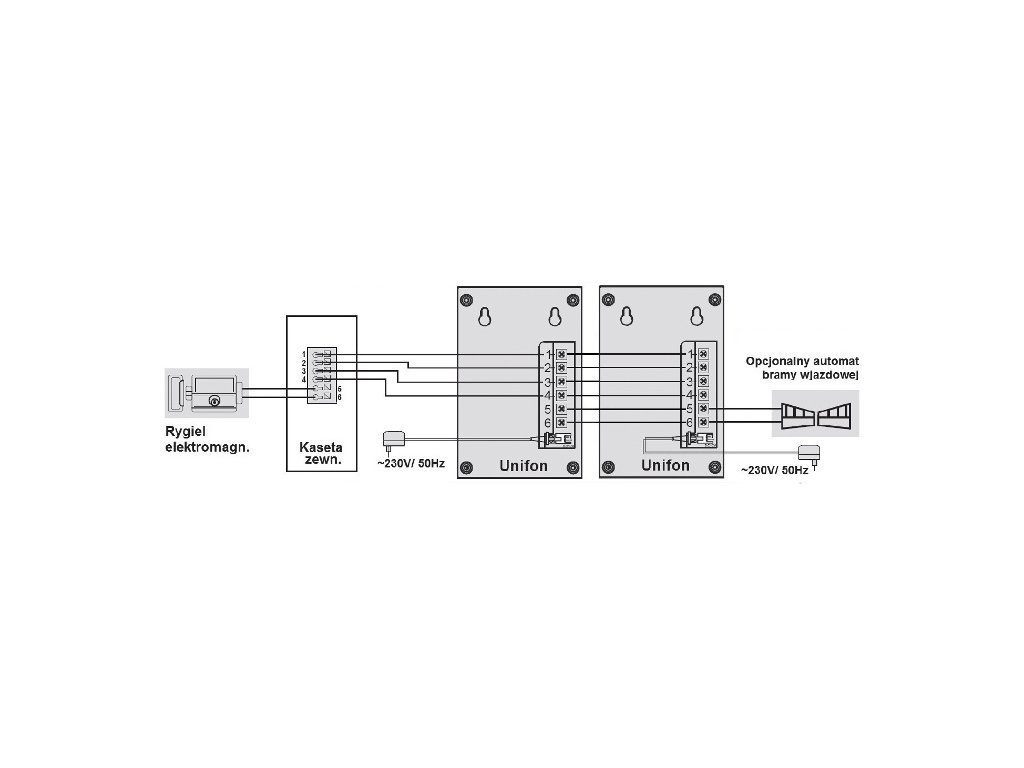 - Zestaw składa się z dwóch głośnomówiących unifonów i kasety zewnętrznej.