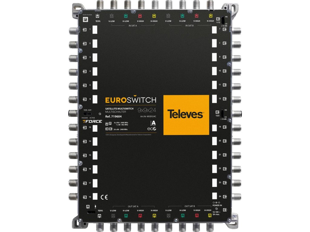Kompaktowy multiswitch wyposażony w 9 wejść (1 wejście naziemne oraz 8 wejść dla dwóch satelitów, każde z czterema polaryzacjami) i 24 wyjścia użytkownika.