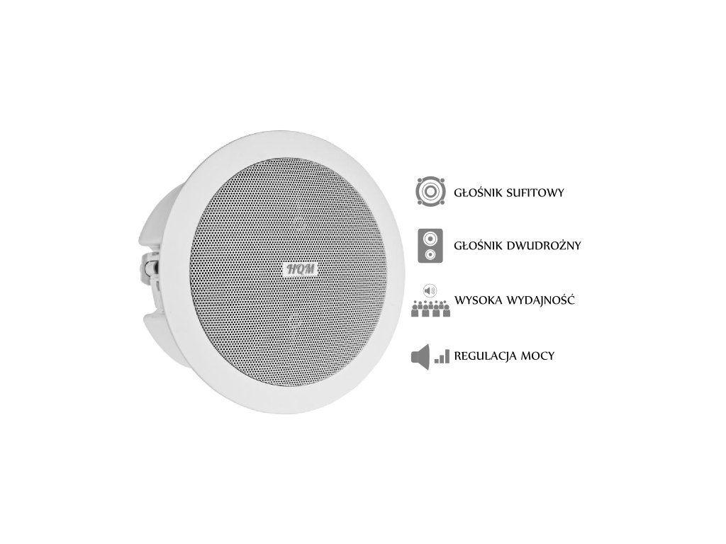Głośnik sufitowy HQM-46SO to urządzenie najnowszej generacji stworzone do celów realizacji profesjonalnych i niezawodnych systemów nagłaśniania przemysłowego. Produkt sygnowany logiem High Quality Music należy do serii innowacyjnych głośników umożliwiających harmonijną projekcję dźwięku. Urządzenie charakteryzuje się niesamowitą mocą brzmienia, łatwością i szybkością instalacji, wysoką jakością dźwięku oraz estetyką wykonania.