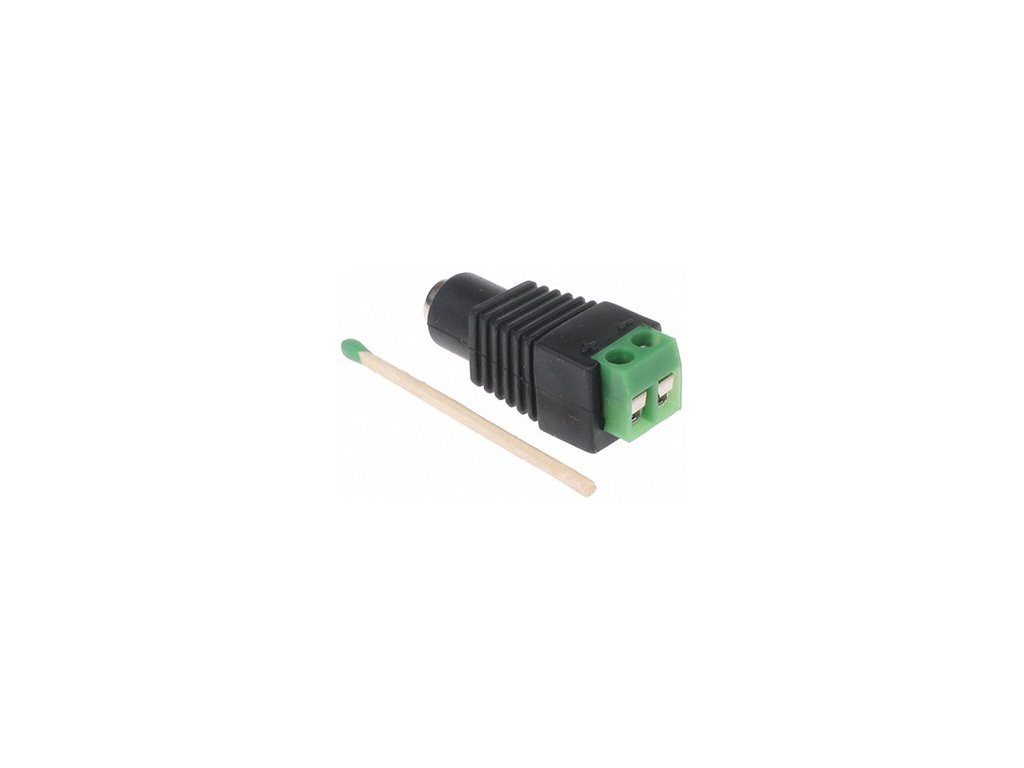 Gniazdo zasilacza ze złączem adaptacyjnym. Szybkozłącze na standardowy wtyk do zasilania kamery.Aby zamontować wtyk wystarczy jedynie odizolować przewody, wcisnąć w zaciski kablowe,a na końcu dokręcić dwa wkręty wkrętakiem krzyżakowym lub płaskim. Nie ma konieczności obcinania wtyczki i lutowania przewodów.