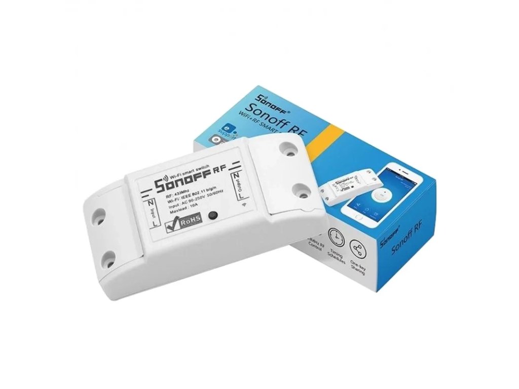 Sonoff RF je lacný inteligentný spínač WiFi s modulom rádiového prijímača 433,92 MHz, ktorý umožňuje jeho ovládanie pomocou rádiového diaľkového ovládania. Ide o diaľkovo ovládaný vypínač, ktorý možno pripojiť k širokému spektru zariadení. Výkonový spínač Sonoff RF prenáša údaje do cloudovej platformy prostredníctvom pripojenia WiFi, ktoré používateľom umožňuje diaľkovo ovládať všetky pripojené zariadenia prostredníctvom mobilnej aplikácie eWeLink.