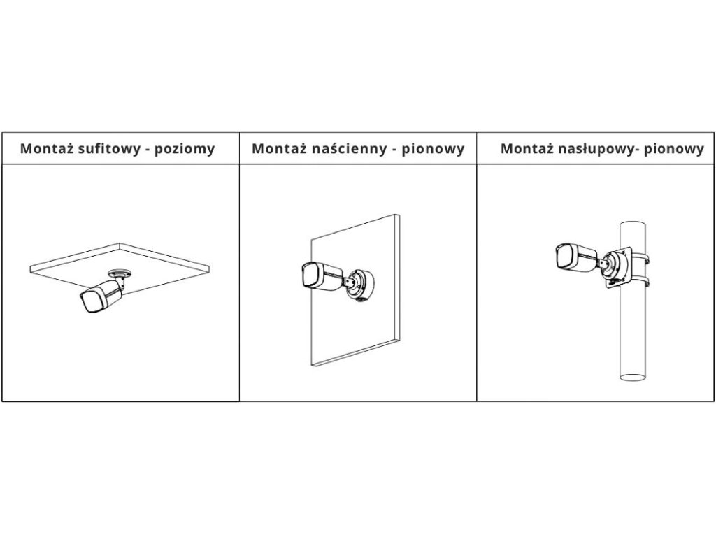 | Montaż | Montaż sufitowy; montaż na ścianie; montaż na pionowym słupie |
