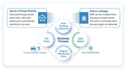 - Po wykryciu człowieka lub pojazdu (IVS) kamera szybko przełącza się do odpowiednich presetów i sprawdza sytuację.