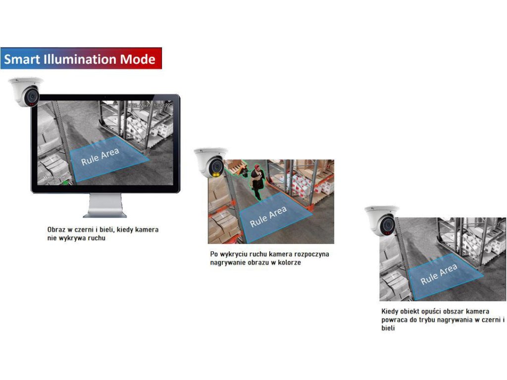 Reflektor światła białego oraz reflektor IR to zaawansowane elementy nowoczesnej technologii Smart Illumination stosowanej w kamerach Kenik. Po wykryciu ruchu, reflektor światła białego aktywuje się, umożliwiając kamerze nagrywanie obrazu w pełnym kolorze, co znacznie ułatwia identyfikację szczegółów. Gdy monitorowany obszar zostaje opuszczony przez obiekt, reflektor IR przejmuje funkcję oświetlenia, a kamera automatycznie przechodzi w tryb czarno-biały, co pozwala na oszczędność energii przy zachowaniu wysokiej jakości nagrań w noc.