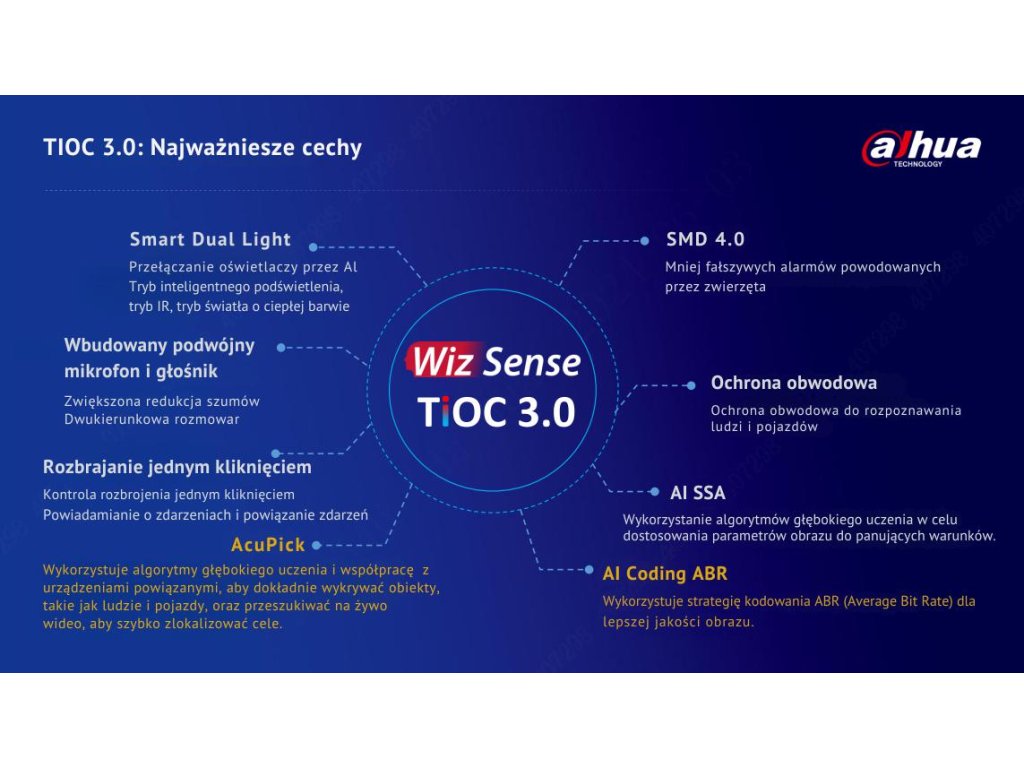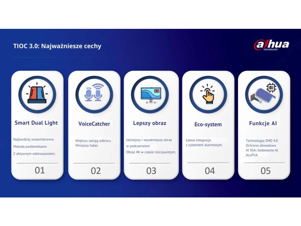 Na podstawie osiągnięć poprzedniej generacji TiOC, najnowsza wersja TiOC 3.0 wprowadza szereg nowych innowacyjnych technologii, wprowadzając przełomowe rozwiązania i poprawę jakości w dziedzinie oświetlaczy, dźwięku, obrazu i AI. Jednocześnie TiOC 3.0 może być zintegrowany z systemem alarmowym co zapewnia lepszy ekosystem, który oferuje większe zabezpieczenie obiektów.