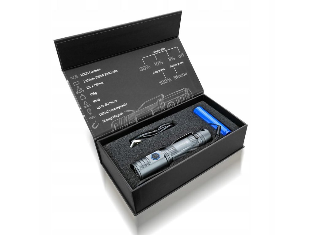 - Maksymalna siła światła latarki na poziomie 2000 lumenów zapewnia jej doskonałe oświetlenie otoczenia nawet w całkowitej ciemności.