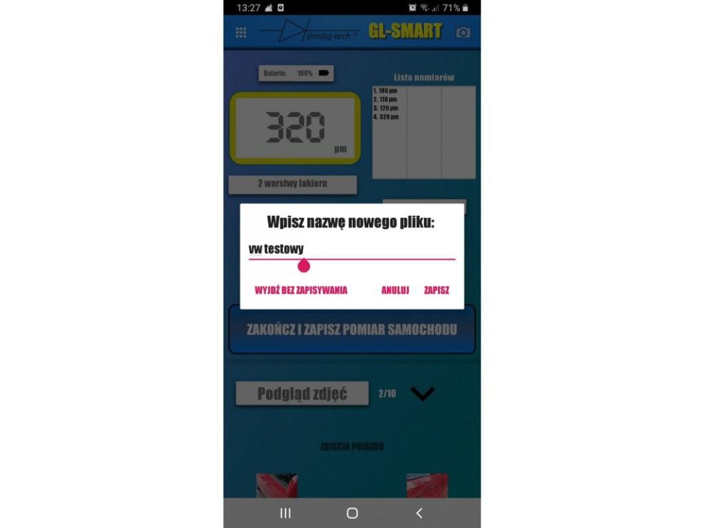 - generowanie raportów z pomiarami i informacjami dodatkowymi takimi jak marka, rejestracja, VIN, uwagi, itp.;
