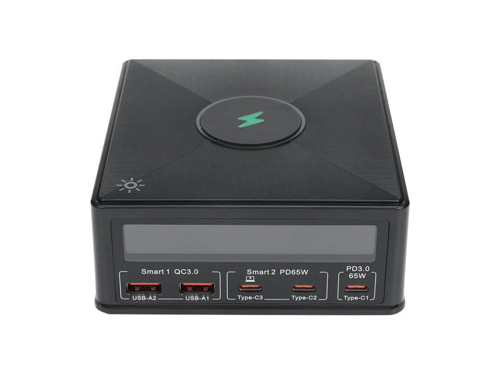 | Výstup | USB-C1: 5V/3A, 9V/3A, 12V/3A, 15V/3A, 20V/3,25A PPS: 3,3-11V /5A, 3,3-21V/3A 65W(Max) USB-C2/USB-C3: 5V/3A, 9V/3A, 12V/3A, 15V/3A, 20V/3,25A PPS: 3.3-11V /5A, 3,3-21V/3A 65W(Max) USB-C2 + USB-C3: 20W + 45W ; USB-A/USB-A2: QC3.0 5V/3A, 9V/2A, 12V/1,5A, 4,5V/5A, 5V/4,5A 22,5W(Max) ; USB-A1 + USB-A2: 12W + 12W |