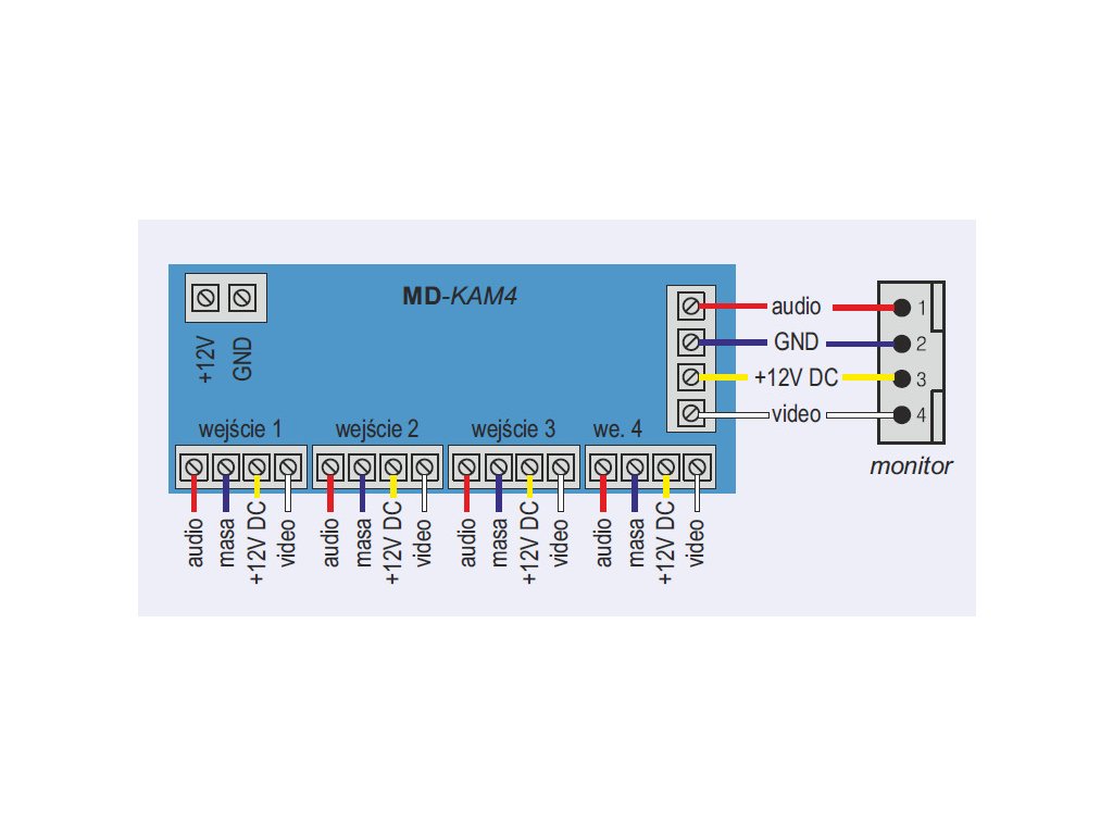 Moduł przekaźnikowy MD-KAM4 przeznaczony jest do stosowania w instalacjach niskonapięciowych. Moduły umożliwiają zwiększenie ilości obsługiwanych wejść przez monitory, bez dodatkowych przewodów (poza lokalnym zasilaniem modułów 12VDC). Współpracuje z wszystkimi modelami monitorów analogowych COMMAX oraz z wejściem analogowym monitorów systemu cyfrowego Gate View COMMAX, moduł działa prawidłowo z kamerami wideo domofonowymi COMMAX (4 żyłowe) jak i z kamerami CCTV służącymi tylko do podglądu (2 żyły). Współpracuje z systemem analogowym COMMAX co ogranicza jego możliwości na dużych odległościach. W typowych instalacjach odległości kamera-moduł-monitor nie powinny przekraczać 100m dla przewodów prostych 0,5mm (do przesyłania wideo zalecane okablowanie ekranowane). Dostarczany w obudowie na szynę DIN 32 (opcja puszka zewnętrzna IP54), zalecany montaż wewnątrz pomieszczeń.