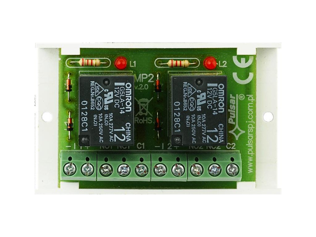 Moduł przekaźnikowy MP2 Zasilanie: 10÷14VDC Przekaźniki: 2x REL-C/NO/NC, 2A@30VDC/50VAC Gwarancja: 2 lata od daty produkcji Gwarancja: 2 lata od daty produkcji Zabezpieczenia: OLP, SCP Wyjście techniczne typu OC i przekaźnikowe: FPS – sygnalizacja