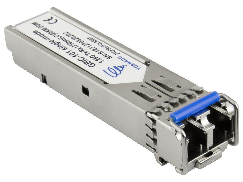 Moduł SFP GBIC-101, single-mode, 1,25G, Tx/Rx:1310, LC, 20KM, DDM (TORNADO) Zastosowanie: Moduł SFP GBIC-101 przeznaczony jest do konwersji sygnału elektrycznego na sygnał optyczny. Dedykowany jest do transmisji po światłowodzie jednomodowym (SM) przy uż