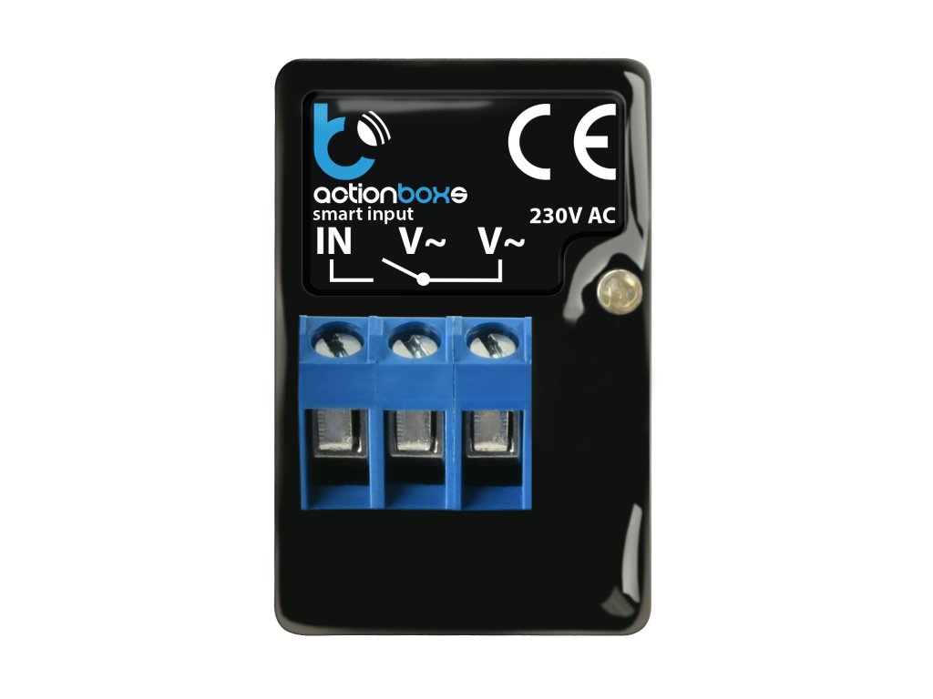 - ActionboxS jest wyposażony w jedno wejście zasilane napięciem 230V, do którego możemy podłączyć różne urządzenia, takie jak włączniki bistabilne lub zwierny, na przykład przyciski dzwonkowe. To wejście pozwala nam aktywować określone akcje, które możemy skonfigurować za pomocą bezpłatnej aplikacji wBox, działającej przez sieć uWi-Fi.