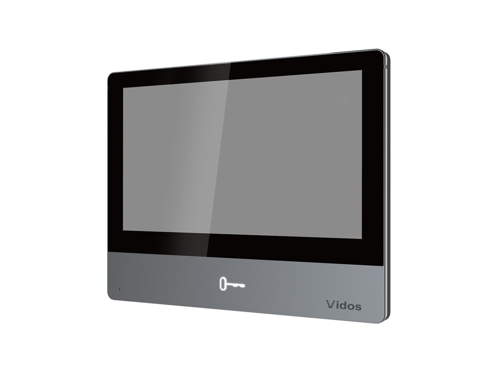 Wewnętrzna jednostka systemu wideodomofonowego VIDOS ONE. Monitor umożliwia komunikację ze stacją bramową, podgląd obrazu ze wszystkich kamer IP w systemie oraz zarządzanie czujnikami alarmowymi zintegrowanymi z wideodomofonem.