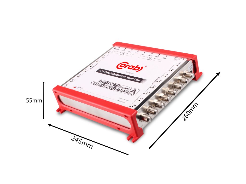 CORAB MULTISWITCH SMART LINE jest to urządzenie służące do rozdzielenia sygnału telewizyjnego, posiada 9 wejść: 8 satelitarnych i 1-dno naziemne oraz 16 wyjść satelitarno-naziemnych. Multiswitch posiada wewnętrzny zasilacz a wysokiej jakości obudowa gwarantuje wysoki poziom ekranowania. Urządzenie samodzielnie wykrywaczy dana antena jest aktywna czy pasywna poprzez odpowiednie dopasowanie napięcia.