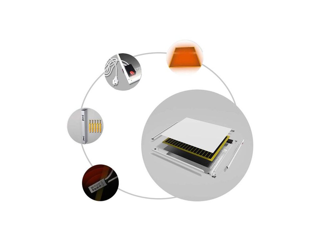 - Płyta grzewcza umieszczona wewnątrz naszego grzejnika składa się z płyty z żywicy epoksydowej FR-4 - która jest użyta jako podłoże - a cząsteczki kryształu węglowego są głównym elementem grzejnym.