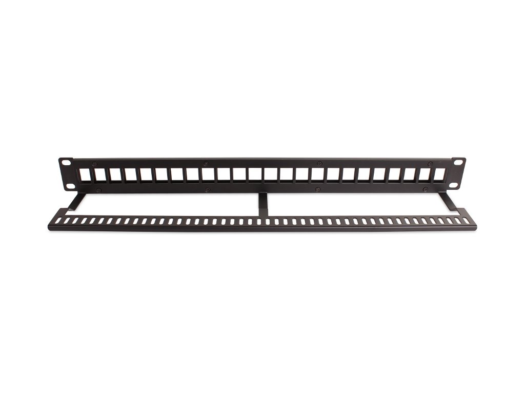 24 portowy uniwersalny panel krosowy zaprojektowany do instalacji w szafach rack 19". Posiada 24 wolne sloty, w których mogą zostać zainstalowane moduły typu keystone w różnych konfiguracjach.