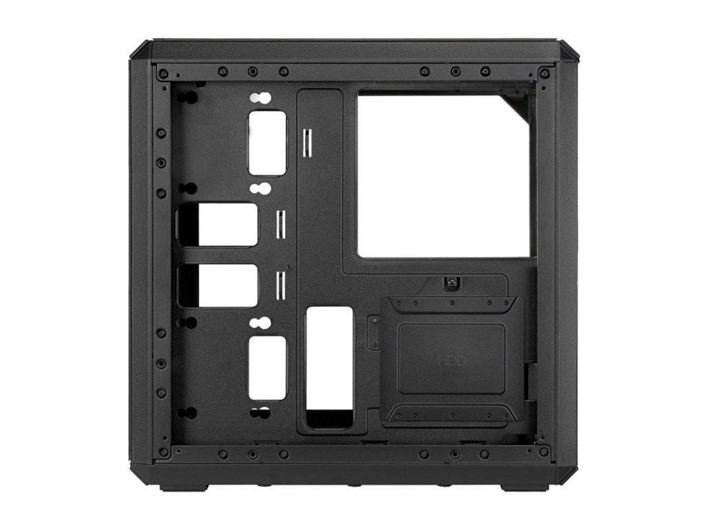 Na ľavej strane sa nachádza panel z tvrdeného skla s hrúbkou 4 mm. Je pripevnený pomocou skrutiek s úchytkami, takže sa dá ľahko vybrať a znova nainštalovať. Priehľadná stena odhaľuje vnútro počítača a jeho komponenty.