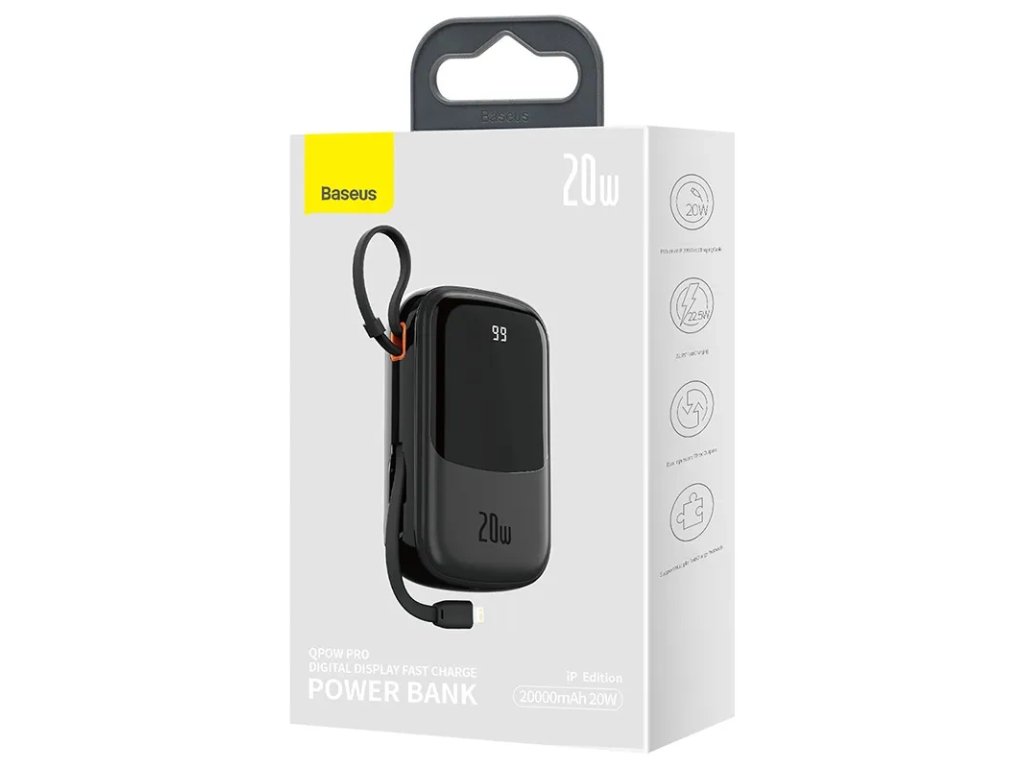 Powerbanka Baseus Qpow PRO s káblom Lightning, porty USB-C a USB, 20000 mAh, 20 W (čierna)