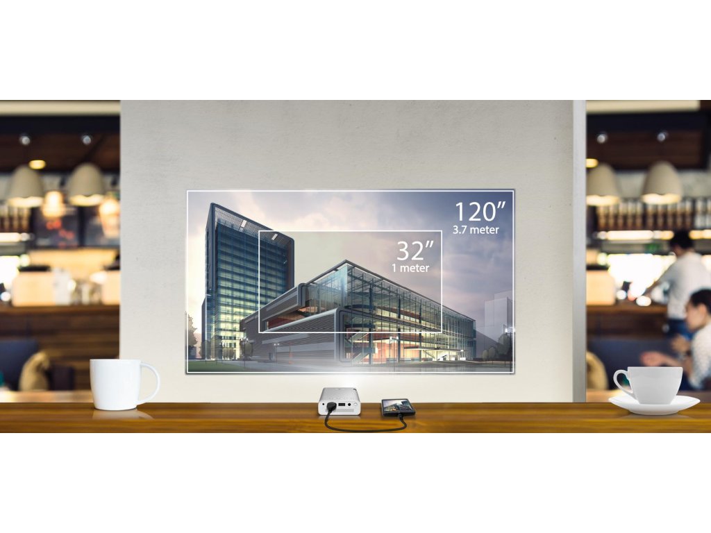 ZenBeam E1R jest w stanie wyświetlać obrazy WVGA o przekątnej do 100 cali (854 x 480), zapewniając dreszczyk emocji na dużym ekranie, nawet w ograniczonej przestrzeni. Obsługuje również treści FHD, a źródło światła LED o mocy 200 lumenów zapewnia żywotność do 30 000 godzin. Automatyczna pionowa korekcja trapezu zapewnia zawsze doskonałe projekcje, a wbudowane gwintowane gniazdo zapewnia kompatybilność ze standardowymi statywami.