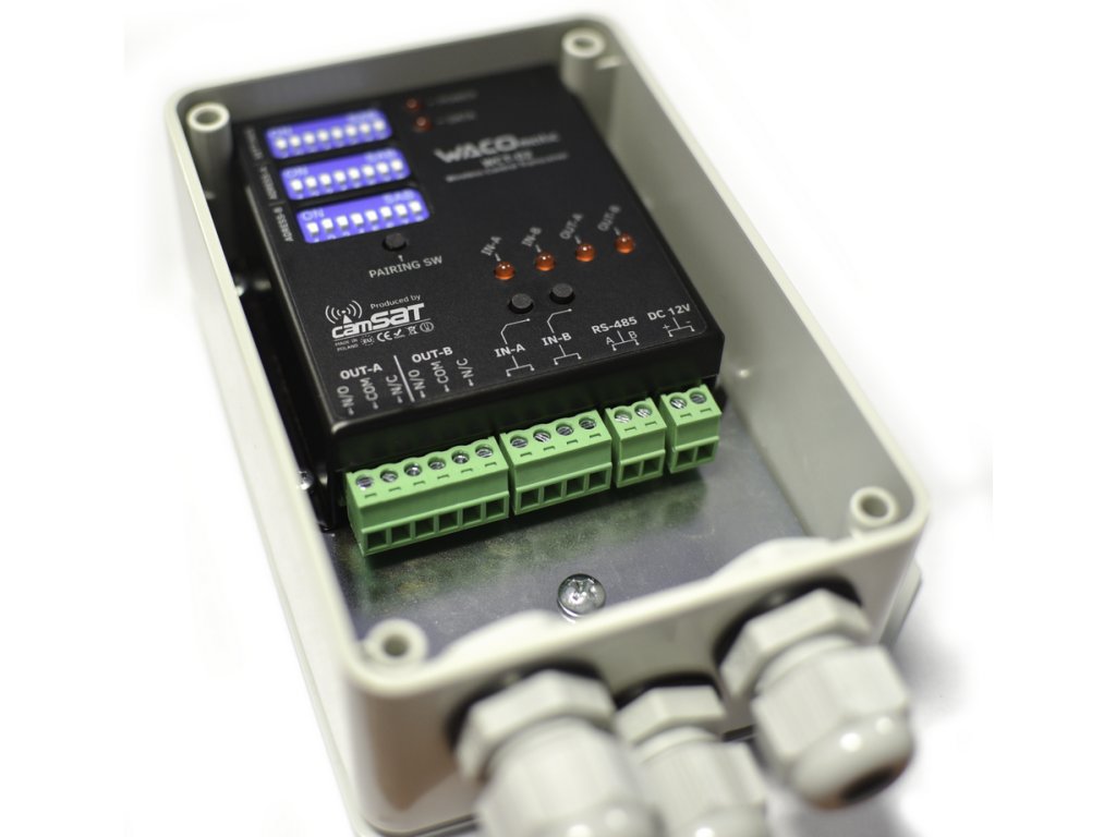 Przekaźnikowy moduł bezprzewodowy – pilot radiowy wraz z odbiornikiem wykonawczym i portami I/O w jednym urządzeniu. Umożliwia zdalne sterowanie w promieniu 3 km oraz sterowanie za pomocą klawiatury PTZ z PELCO-P.WCT-02 to transceiver dwukierunkowy pracujący w paśmie 868-869 MHz, umożliwiający zdalne sterowanie radiowe wieloma różnymi urządzeniami przy wykorzystaniu protokołu PELCO (RS485), pracującymi w instalacji automatyki przemysłowej w promieniu 3 km.
