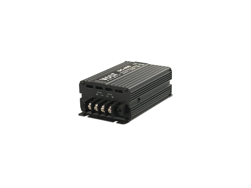 Przetwornica elektroniczna DC-400 jest nowoczesnym bezzakłóceniowym urządzeniem elektronicznym przeznaczonym do obniżania napięcia instalacji samochodowych 24V na 12V. Przetwornica DC-400 wyposażona została w szereg zabezpieczeń, dzięki czemu idealnie nadaje się do zasilania odbiorników samochodowych typu: CB, lodówka, radio i inne.