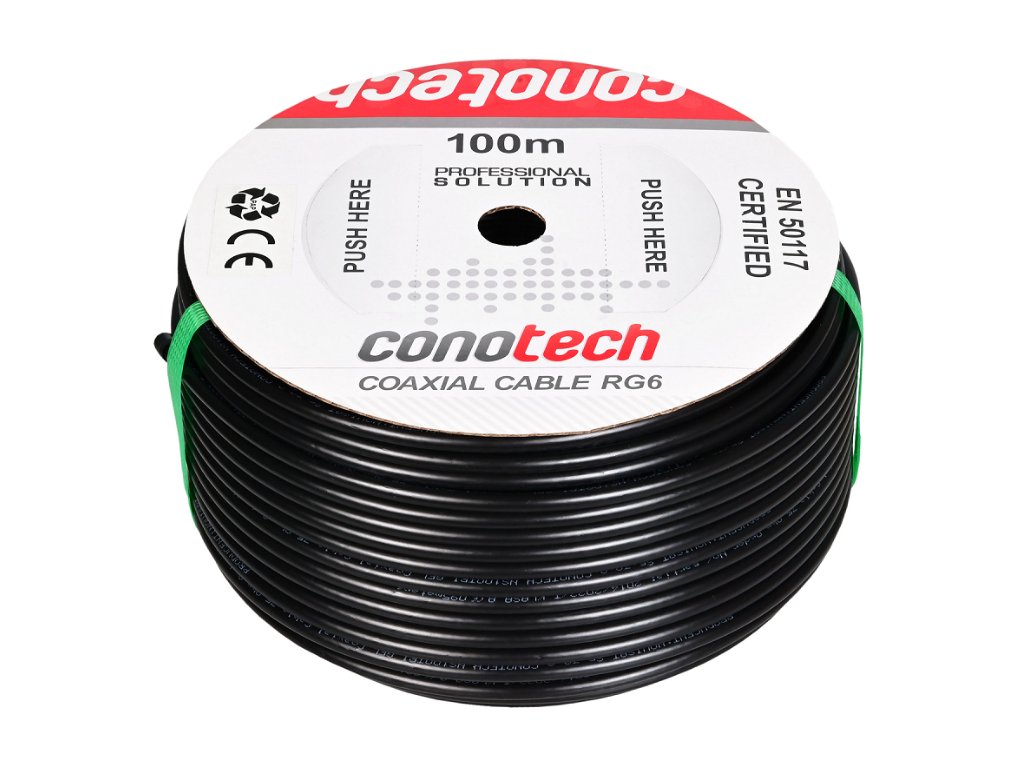 Wysokiej jakości, potrójnie ekranowany kabel koncentryczny typu RG6, o żyle wewnętrznej wykonanej z drutu miedzianego o średnicy 1,00 mm. Przewodnik został otulony polietylenem spienianym fizycznie azotem (N), cechującym się szczególnie skuteczną izolacją dielektryczną. Ekranowanie przewodu wykonane jest zgodnie ze standardem Trishield, w którym stosuje się potrójne zabezpieczenie rdzenia, składające się z warstwy folii aluminiowej AL/PET, oplotu aluminiowego o współczynniku pokrycia aż 90% oraz kolejnej warstwy folii aluminiowej AL/PET. Ponadto przewód został wypełniony żelem hydrofobowym, zapewniającym odporność kabla na wzdłużoną penetrację wody. Powłoka zewnętrzna wykonana jest z polietylenu (PE) w kolorze czarnym, o średnicy 6,8 mm, która pełni funkcję ochronną przed uszkodzeniami mechanicznymi oraz zewnętrznymi warunkami atmosferycznymi.