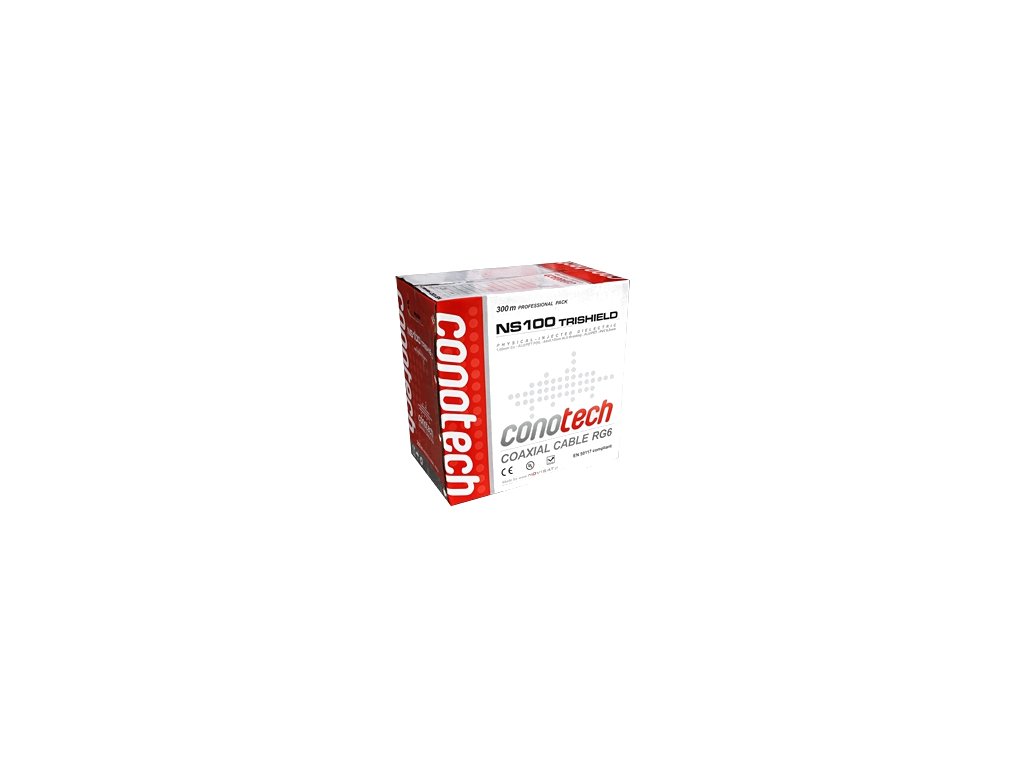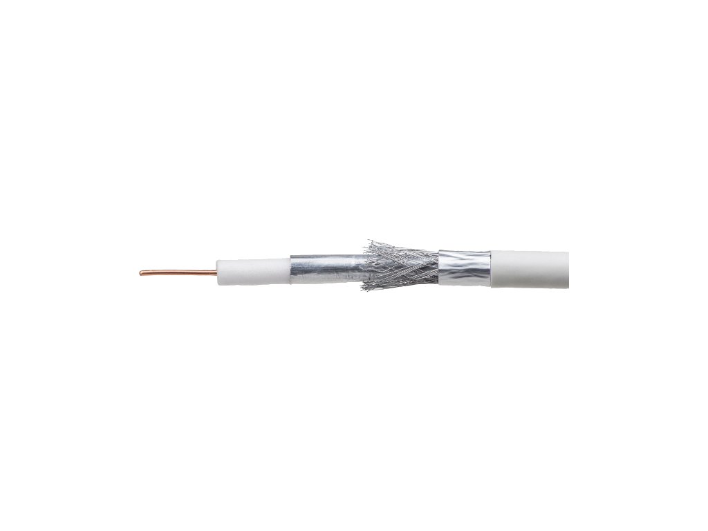 Wysokiej jakości , potrójnie ekranowany kabel koncentryczny typu RG6 o żyle wewnętrznej wykonanej z drutu miedzianego, izolacja polietylenowa spieniana fizycznie azotem (N), pokryta folią aluminium/PET, oplotem z drutów aluminiowych i kolejną folią aluminium/PET oraz powłoką polwinitową PVC.