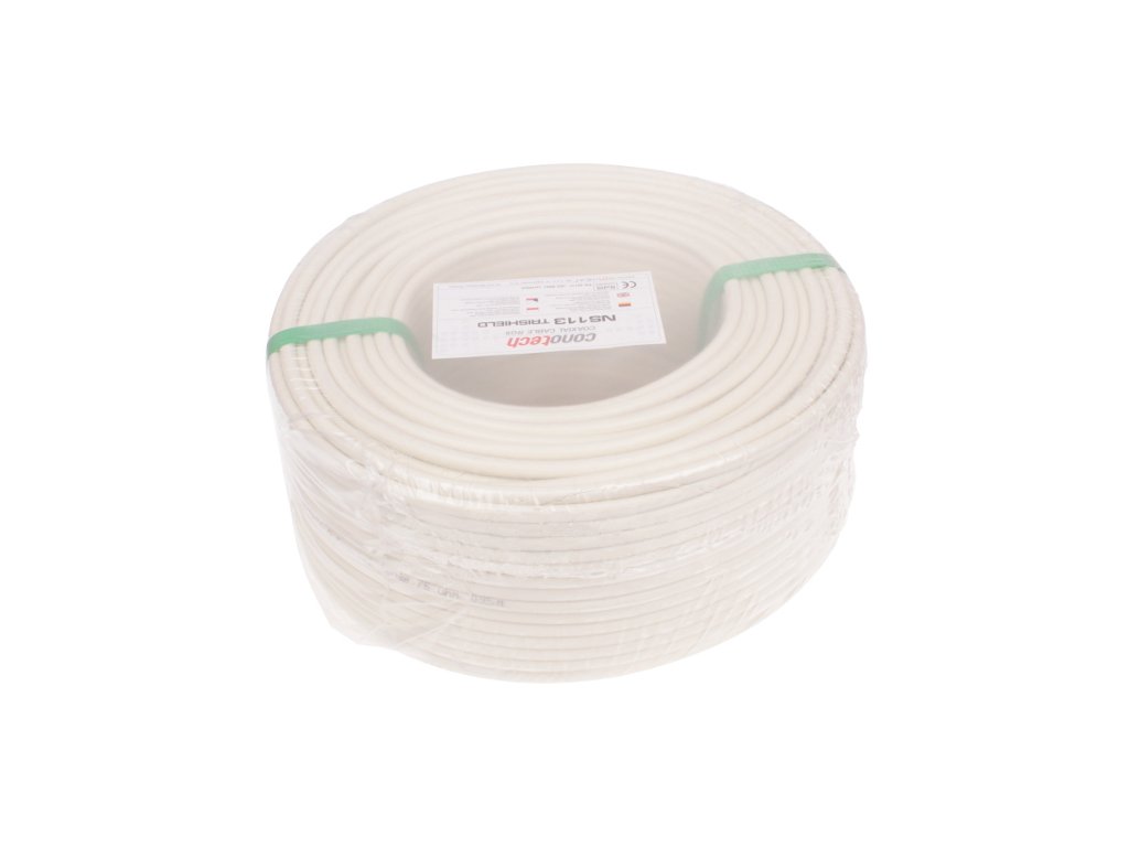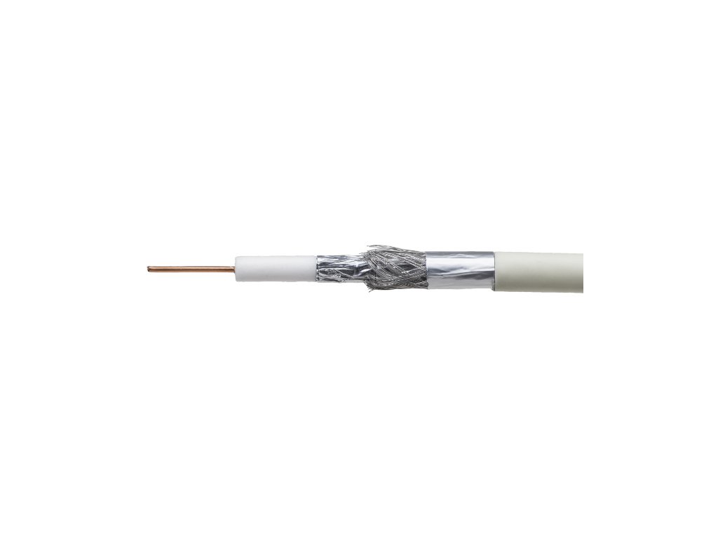Wysokiej jakości , potrójnie ekranowany kabel koncentryczny typu RG6 o żyle wewnętrznej wykonanej z drutu miedzianego, izolacja polietylenowa spieniana fizycznie azotem (N), pokryta folią aluminium/PET, oplotem z drutów aluminiowych i kolejną folią aluminium/PET oraz powłoką pólwinitową PVC.