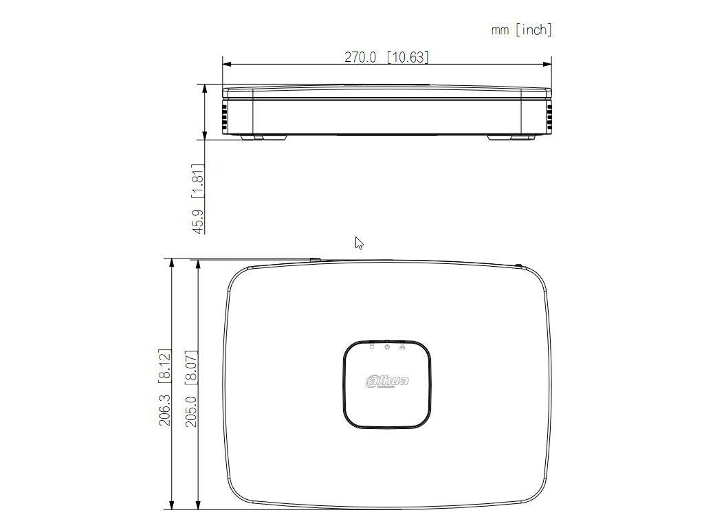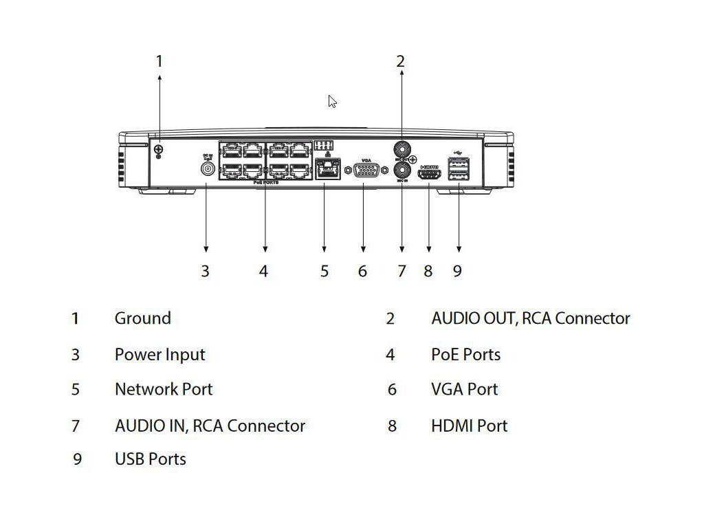 | Port | Wejście audio: 1 × RCA, Wyjście audio: 1 × RCA, Interfejs dysku: 1 port SATA, do 10 TB. Maksymalna pojemność HDD różni się w zależności od temperatury środowiska. USB: 2 (2 porty USB 2.0 z tyłu), HDMI: 1, VGA: 1, Port sieciowy: 1 (10/100/1000 Mbps Ethernet, RJ-45), Port PoE: 8 × porty PoE (10/100 Mbps). |