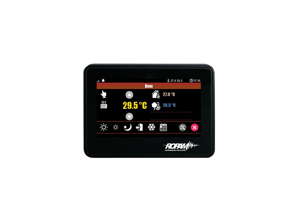 - funkcja termostatu pokojowego (2 niezależne), kalendarz tygodniowy, pięć profili temperatury,, cztery przedziały dzienne, synchronizacja na wybranych panelach i aplikacji mobilnej (IP)