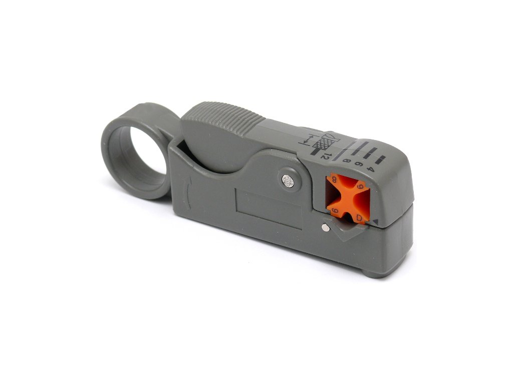 Ściągacz to przydatne urządzenia dla instalatora, który często zarabia końcówki przewodów koncentrycznych. Urządzenie wyposażone jest w dwa nastawne nożyki regulowane znajdującym się w komplecie kluczykiem. Regulacja szerokości pozostawionego ekranu 4, 6, 8 i 12 mm.