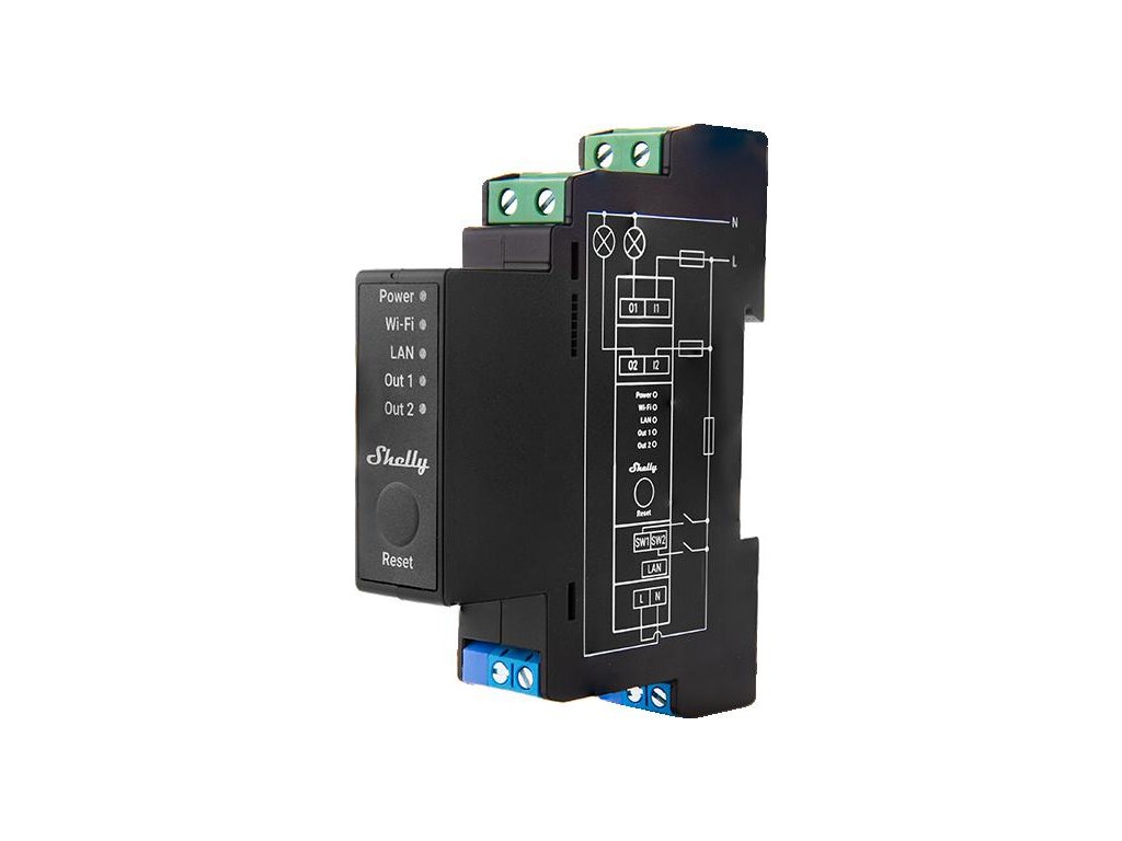 Shelly Pro 2PM v.1 – Dwukanałowy przekaźnik DIN z pomiarem energii, LAN, Wi-Fi, Bluetooth, obsługą automatyki i zabezpieczeniami
