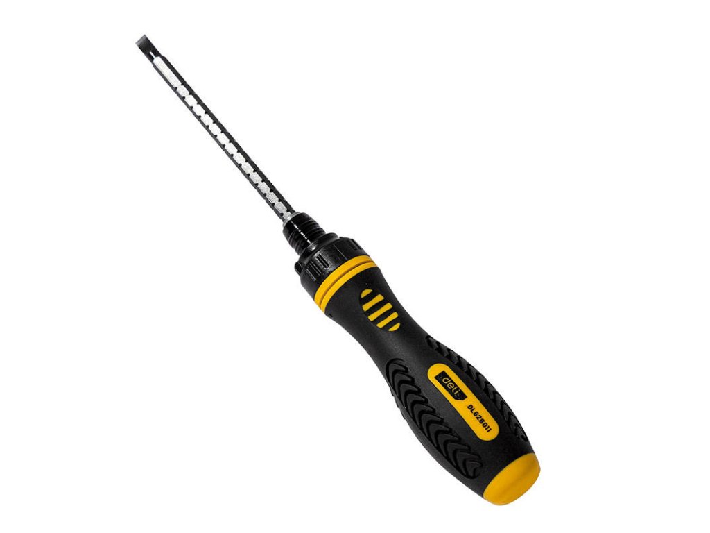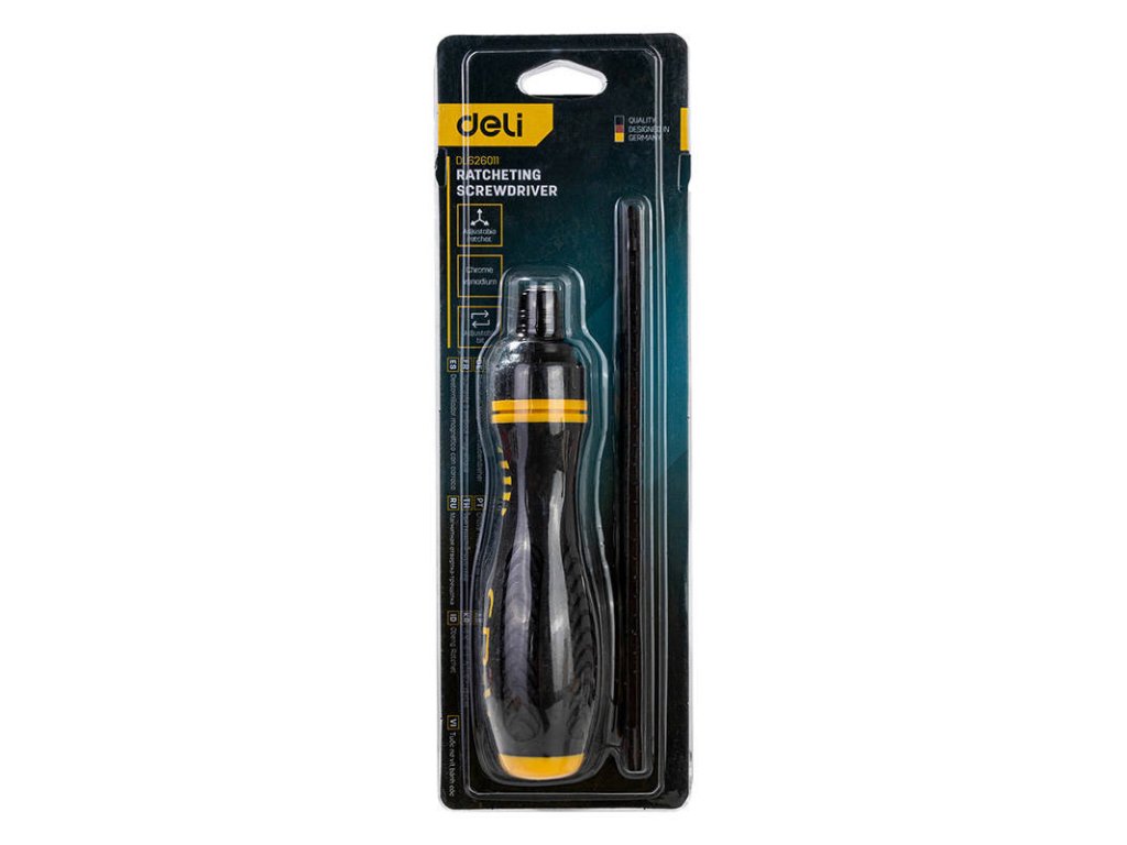 Skrutkovač s račňou Deli Tools EDL626011 vám poskytne vysoký komfort pri vykonávaní vašej práce. Rukoväť bola vyrobená z kombinácie materiálov TPR a PP, čím sa dosiahla mimoriadna odolnosť a zaručuje bezpečné uchopenie. Náradie je vybavené račňou s vysokým krútiacim momentom, ktorá je zodpovedná za jednoduché ovládanie bez námahy.