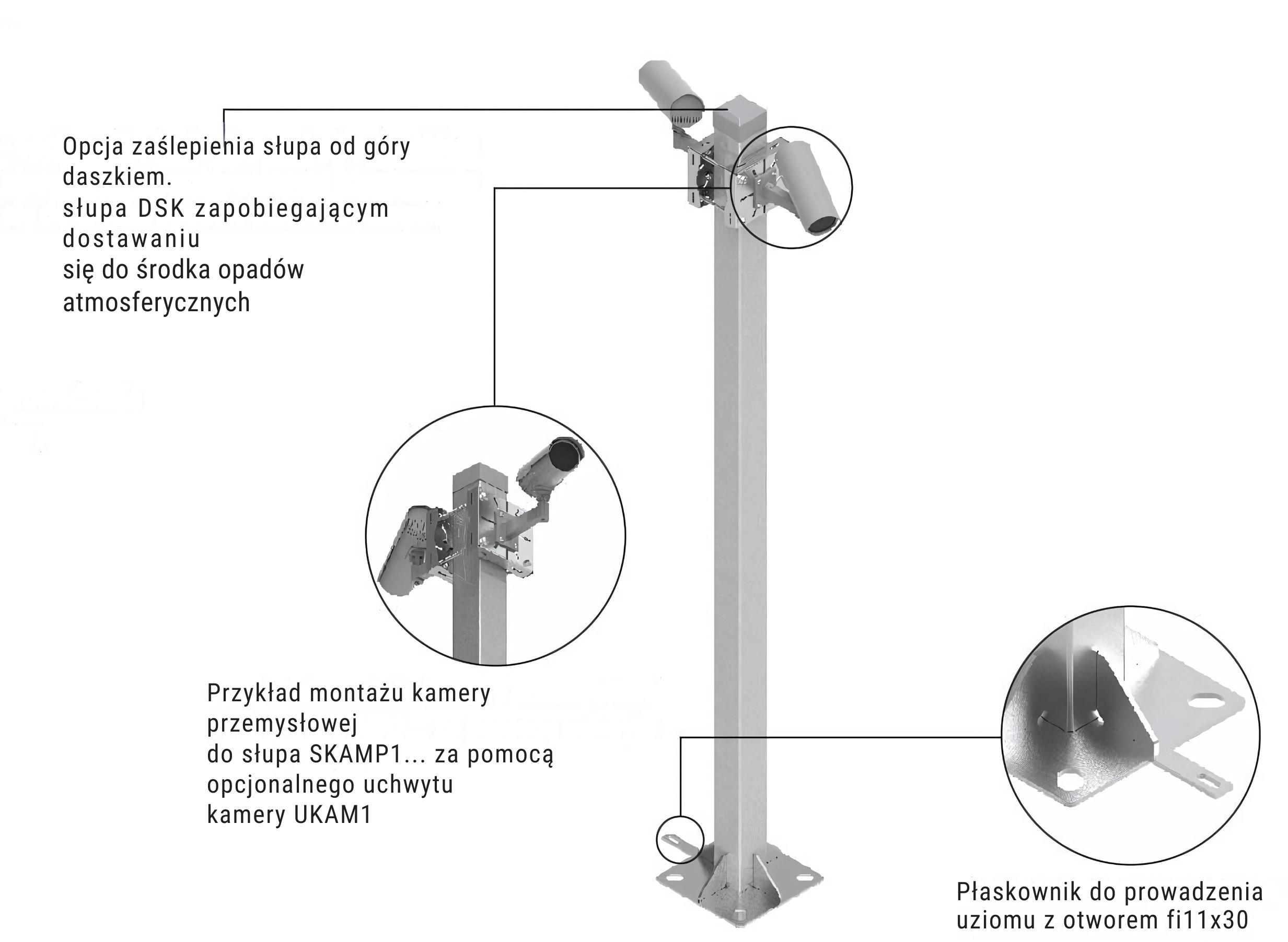 - kamery lub oświetlenie można zamontować za pomocą wkrętów samowiercących bezpośrednio do słupa lub bezinwazyjnie za pomocą uchwytów US lub UKAM...