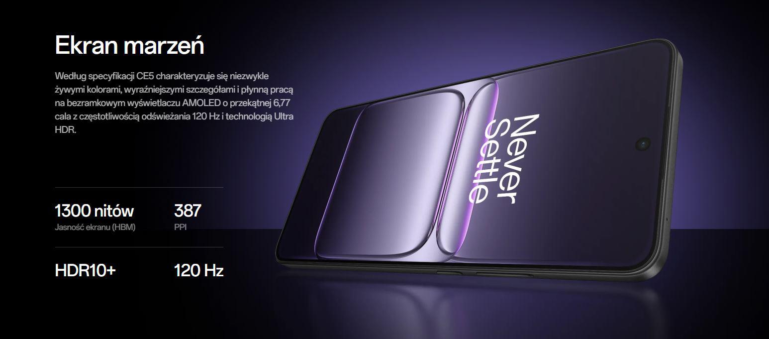 OnePlus Nord CE5 wyposażono w 6,77-calowy wyświetlacz Fluid AMOLED o rozdzielczości FHD+ (2392 × 1080 pikseli) z częstotliwością odświeżania 120 Hz, która zapewnia jedwabiście płynne animacje podczas przeglądania, grania i oglądania filmów. Panel wyświetla ponad miliard kolorów w 10-bitowej głębi i osiąga szczytową jasność 1450 nitów, gwarantując doskonałą czytelność nawet w pełnym słońcu. Ekran obsługuje formaty HDR10+ i HLG, pokrywa przestrzeń barw DCI-P3 i oferuje kilka trybów kolorystycznych – od żywego po kinowy. Wyświetlacz chroni szkło Panda Glass, a wypełnienie frontu ekranem wynosi 89%.