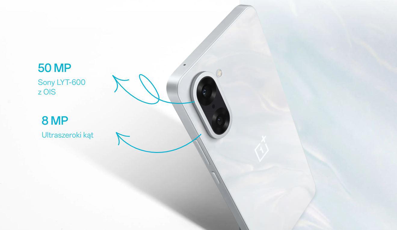OnePlus Nord CE5 oferuje podwójny system aparatów z głównym sensorem 50 MP Sony LYT-600 (1/1.95", f/1.8) wyposażonym w optyczną stabilizację obrazu OIS i autofokus fazowy PDAF, który gwarantuje ostre zdjęcia nawet w ruchu i przy słabym oświetleniu. Uzupełnieniem jest ultraszerokokątny obiektyw 8 MP o kącie widzenia 112° i przysłonie f/2.2, idealny do fotografowania krajobrazów i wnętrz. Smartfon nagrywa wideo w rozdzielczości 4K przy 60 klatkach na sekundę z płynnym przechodzeniem między obiektywami oraz oferuje tryb zwolnionego tempa do 480 fps w Full HD. Przedni aparat 16 MP Sony IMX480 z przysłoną f/2.4 zapewnia szczegółowe selfie i wyraźne rozmowy wideo.