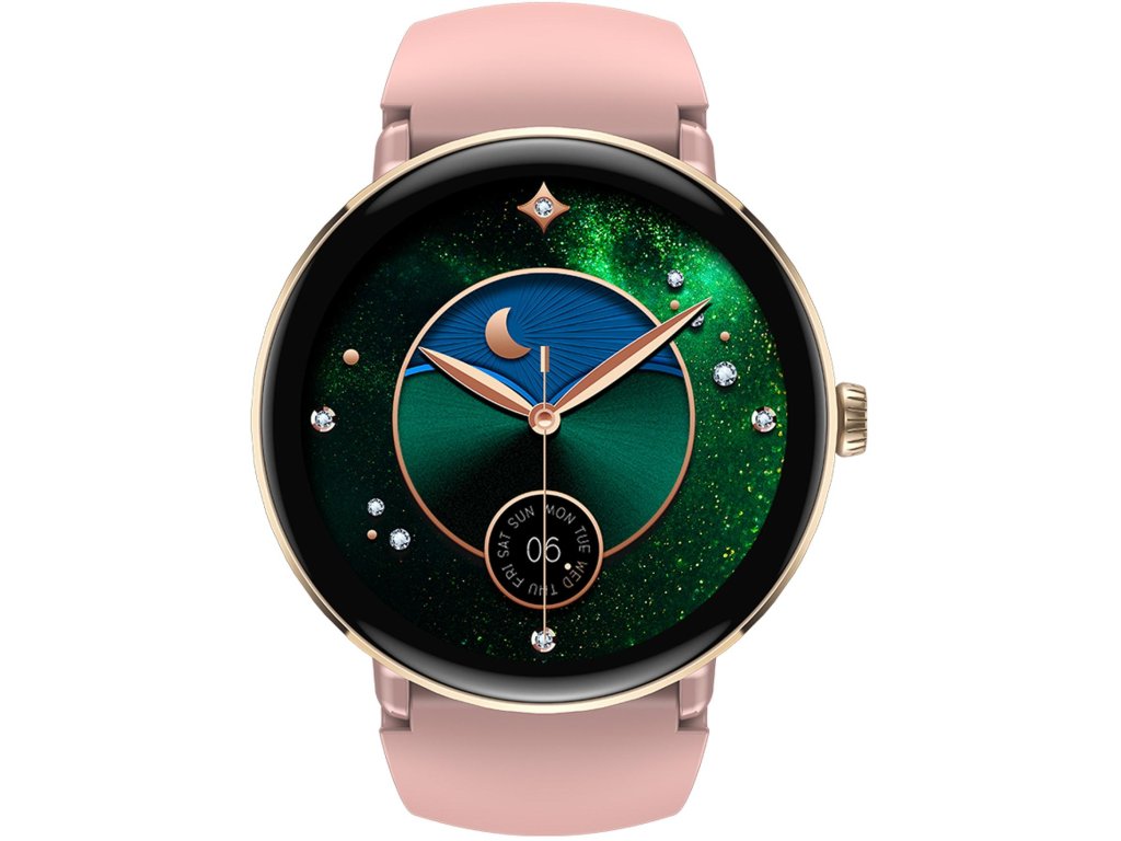 - kobiecy smartwatch z ekranem AMOLED i funkcjami zdrowotnymi