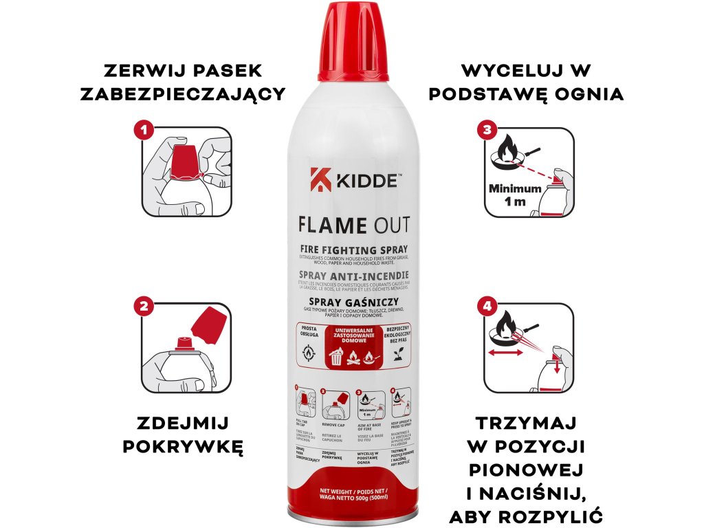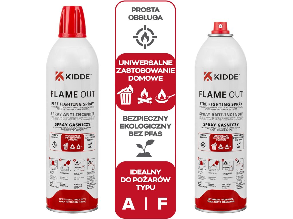Spray gaśniczy Kidde FlameOut 500 ml to nowoczesne i ekologiczne rozwiązanie do szybkiego gaszenia niewielkich pożarów typu A oraz F. Skutecznie radzi sobie z najczęstszymi zagrożeniami domowymi, takimi jak pożary tłuszczu, drewna, papieru czy odpadów. To praktyczny element wyposażenia domu, który doskonale uzupełnia podstawowe zabezpieczenia przeciwpożarowe.