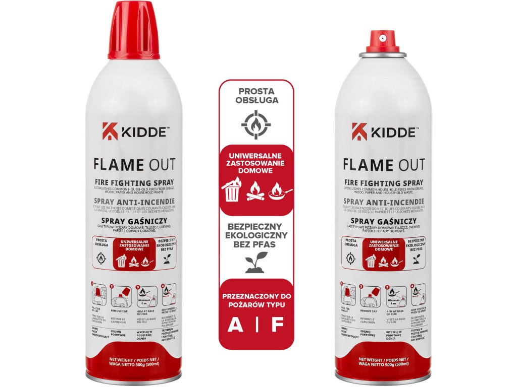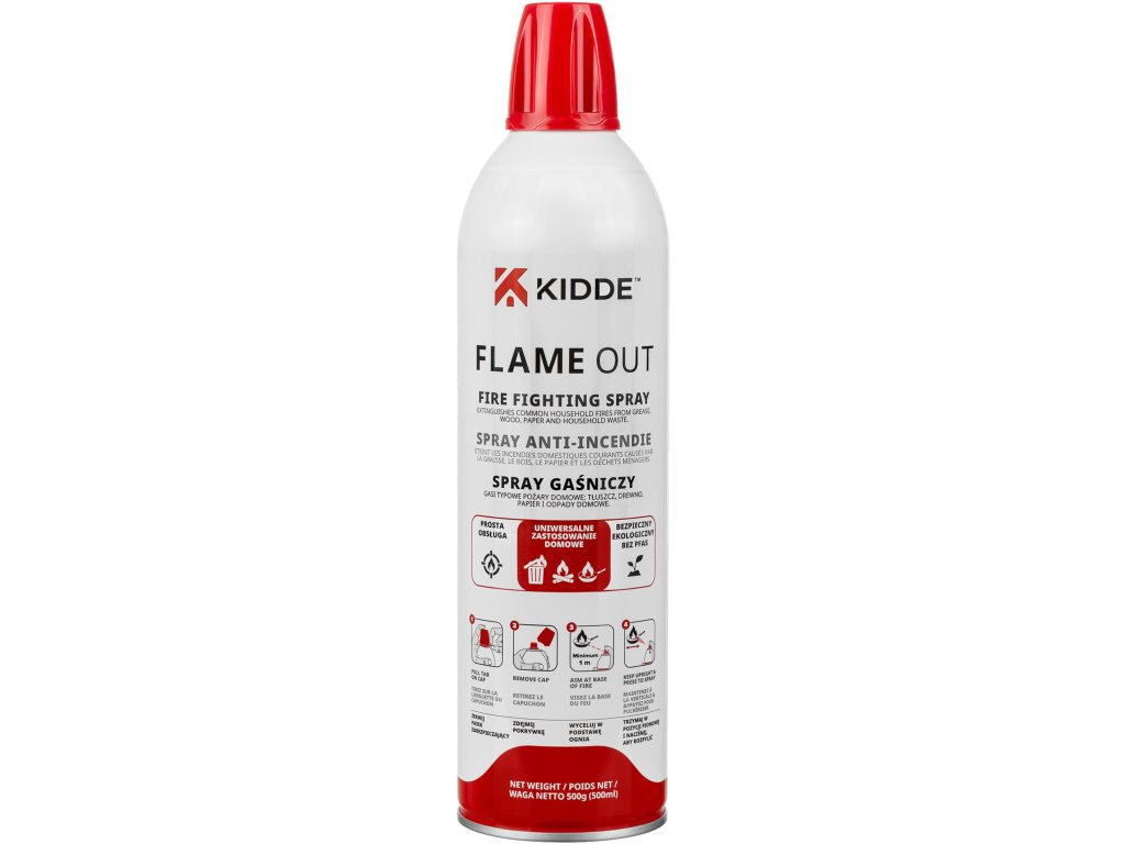 Spray gaśniczy Kidde FlameOut idealnie sprawdzi się w kuchni, salonie, przy grillu czy w innych pomieszczeniach mieszkalnych. Może być również używany w domkach letniskowych, altanach, kamperach, przyczepach kempingowych oraz samochodach rekreacyjnych.